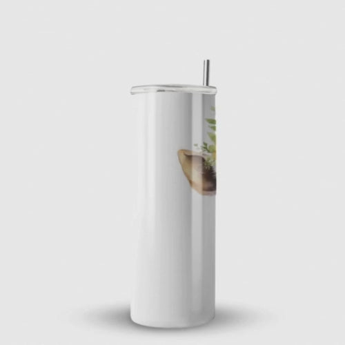Giraffe With Flowers, This design is printed on a high-quality, 600ml, stainless steel tumbler and comes with a stainless steel straw. The tumbler is double walled and suitable for hot or cold drinks. The tumbler also has a non slip base which also helps to protect surfaces. The tumbler has a suction push on lid with a slider to drink from or to add the straw.