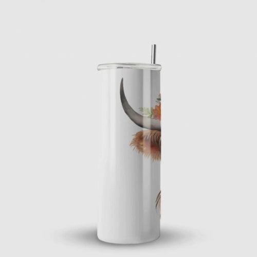 Highland Cow With Flowers, This design is printed on a high-quality, 600ml, stainless steel tumbler and comes with a stainless steel straw. The tumbler is double walled and suitable for hot or cold drinks. The tumbler also has a non slip base which also helps to protect surfaces. The tumbler has a suction push on lid with a slider to drink from or to add the straw.