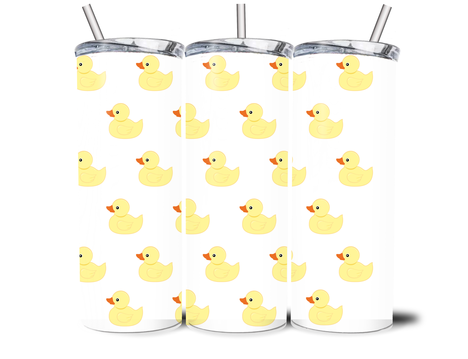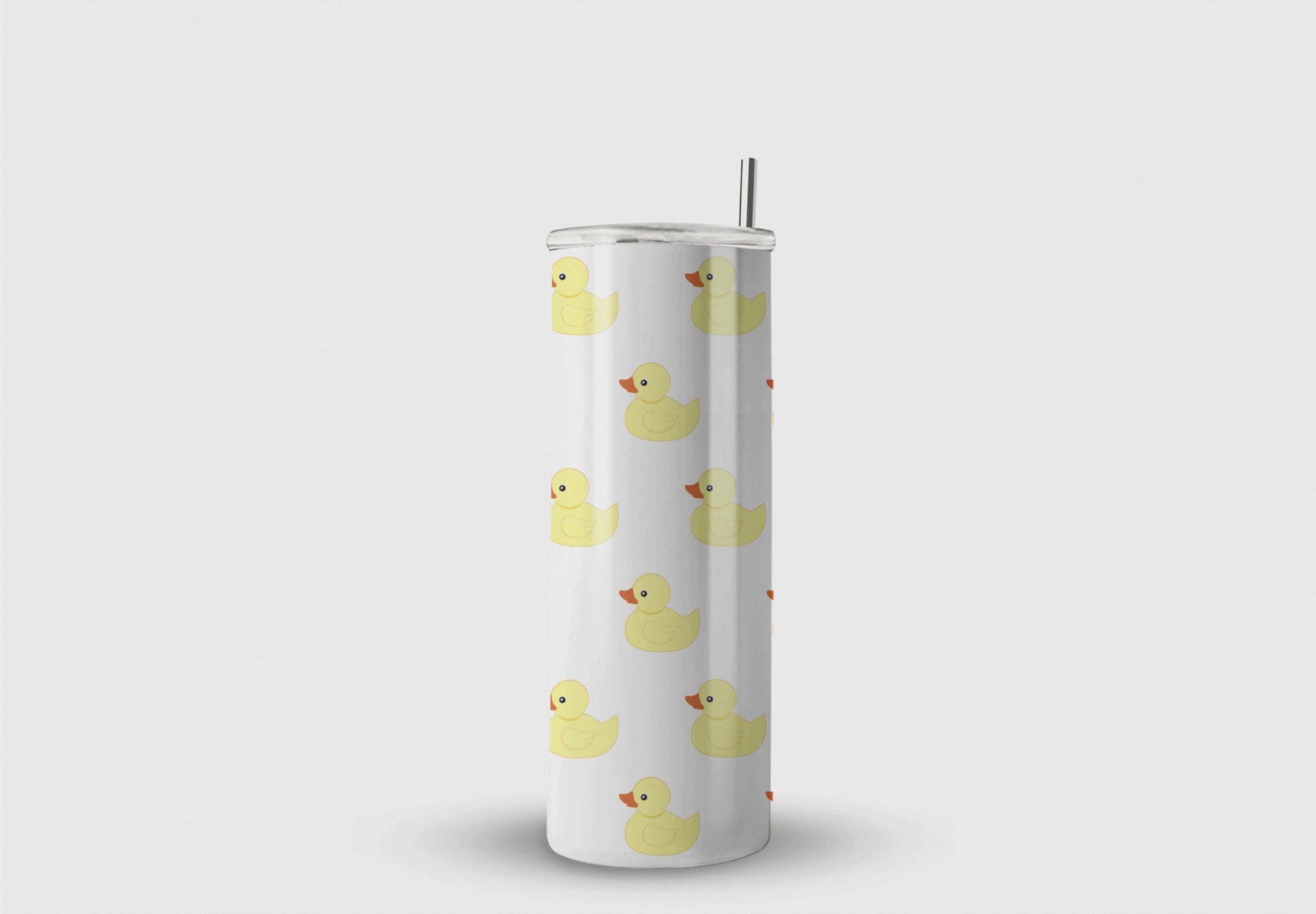 Rubber Duck Wrap, This design is printed on a high-quality, 600ml, stainless steel tumbler and comes with a stainless steel straw. The tumbler is double walled and suitable for hot or cold drinks. The tumbler also has a non slip base which also helps to protect surfaces. The tumbler has a suction push on lid with a slider to drink from or to add the straw.