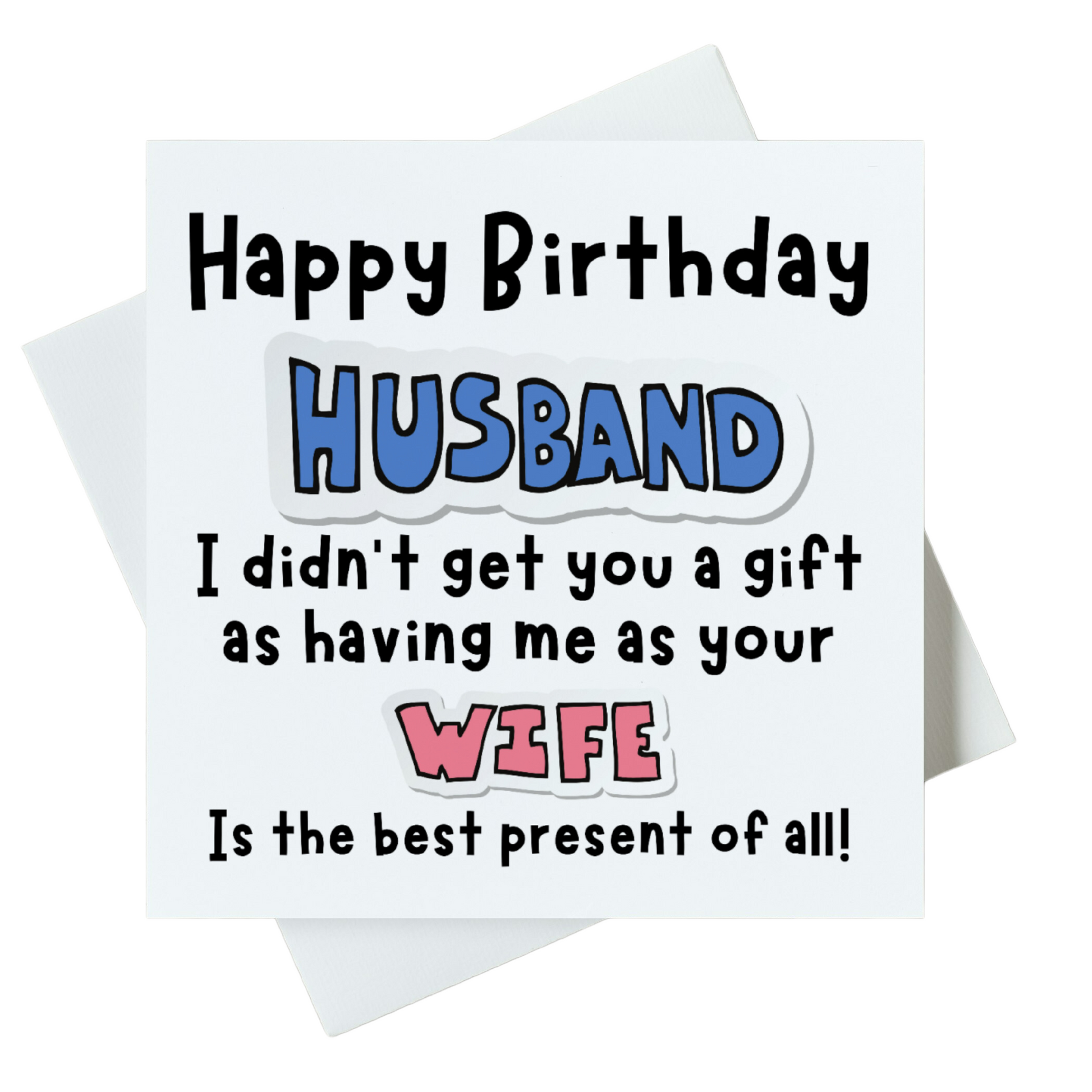 'Happy Birthday Husband I Didn't Get You A Gift As Having Me As Your Wife Is The Best Present Of All' Design. This birthday design is printed on high quality 300gsm card and comes with a white envelope.